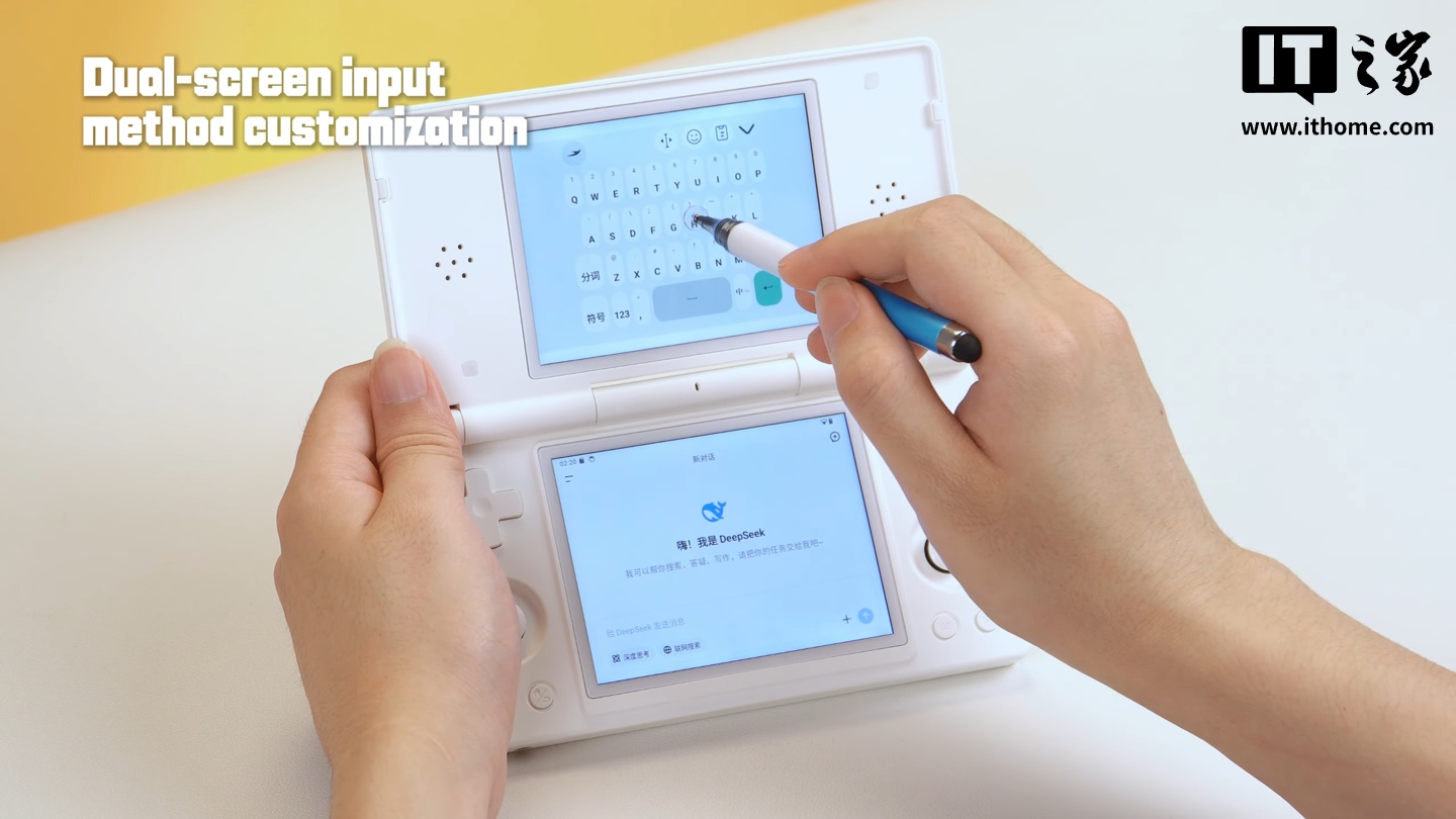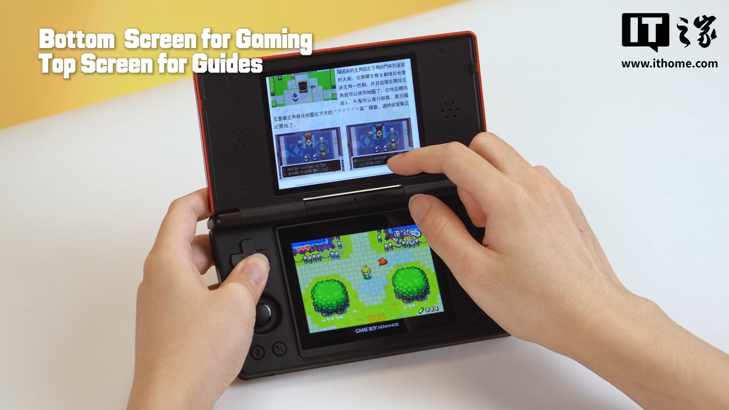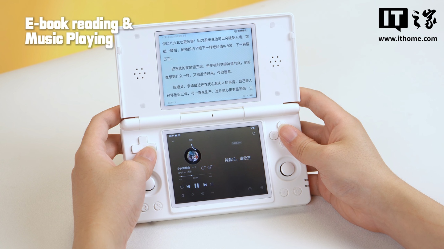 此外,这款掌机还支持分屏功能,可以在下屏玩 GBA 游戏的同时用上屏打开游戏攻略,还可在听音乐的同时看电子书,当单屏运行应用时,另一块屏幕还能变成虚拟键盘。